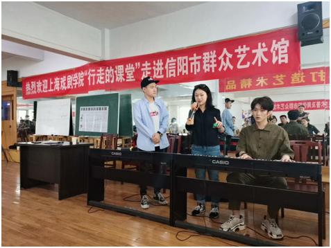 由继续教育学院音乐表演专业教师石灵老师赴信阳市群众艺术馆开展了《感受弹唱的美》音乐表演工作坊,前来参与学习的信阳群众艺术馆合唱团成员在音乐表演的师生的教学互动下感受到了来自演唱与演奏不一样的体验和收获,工作坊现场石灵老师讲述了即兴伴奏中和弦的配置,简易的曲式分析等专业知识,也带领专业学生进行了互动弹唱,工作坊的开展为此次上戏师生走进信阳,增添了更多育人育德的意义。