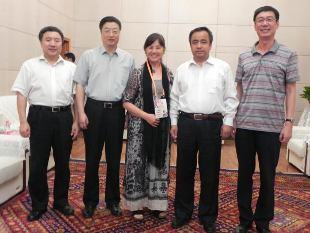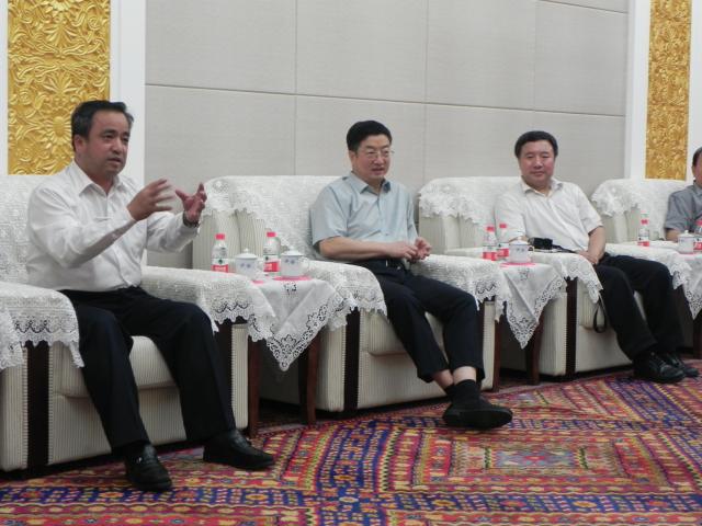 图为新疆维吾尔自治区领导与韩生院长亲切交流 |