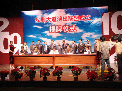 早在今年4月份,上海戏剧学院率先发出倡议:成立戏剧大道演出联盟。这一提议立即得到了周边区域的上海话剧艺术中心、中福会儿童艺术剧院、静安区文化局和徐汇区文化局等多家单位的积极响应。经过各方友好协商,戏剧大道的软件建设目标可以概括为:一二三四十百千万。即:成立一个联盟机构,两手抓精品工程和原创工程,三种不同体制的单位合作(政府、艺术高校、演出院团),每年组织四个演出季(节),盘活十个剧场,推出一百台剧目,上演一千场演出,吸引数十万观众。为实现这一目标,演出联盟要实现“五个整合与共享”:人才资源的整合与共享,剧目资源的整合与共享,硬件设施的整合与共享,宣传与票务的整合与共享,以及推广新人的整合与共享。