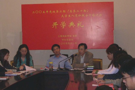 昨晚6点,2005年上海戏剧学院党校第二期大学生入党积极分子培训班开学典礼于佛西楼会议室隆重举行。组织部部长张依顺,学生处处长、学生党总支书记邱中岳老师以及各系、研究生部、成教和青春舞蹈团的四十余名入党积极分子共同参加了本次开学典礼。典礼由院团委副书记、本次党训班班主任陈云老师主持。