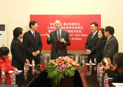 2006年2月20日,被誉为“创意产业之父” 的约翰•霍金斯走进上海戏剧学院,正式接受了上海戏剧学院创意学院国际副院长、客座教授以及上海戏剧学院校务委员会委员聘书。上海市人大常委会副主任厉无畏见证了这一时刻。随后,霍金斯以这一身份,与上戏师生进行了关于创意产业方面的探讨交流。这一举动,标志着这位创意产业大师正式开始了与上海的全面合作。