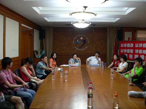 2006年6月29日下午,评估专家组一行四人,前往我院戏曲学院、舞蹈学院进行评估工作检查指导。专家组在听取了戏曲学院、舞蹈学院的自评报告后,给出了许多宝贵的意见和建议。随后,专家们参观了莲花路校区练功房、小剧场等教学硬件设施,观看了学生排练,并举行了师生见面会,对于我院戏曲学院、舞蹈分院的办学方针和特色给予了充分肯定,并提出具有针对性的指导意见。