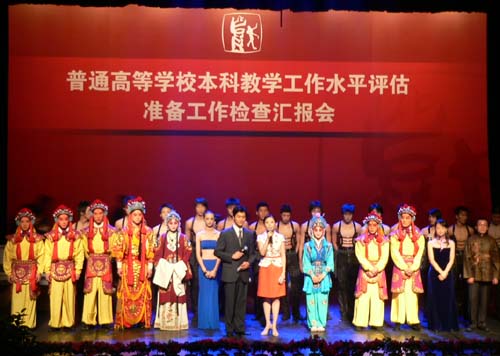 韩生副院长主持欢迎仪式。上海市教委副主任张民选代表市教委对专家组的到来表示欢迎并希望专家们提出宝贵意见。贺寿昌书记致欢迎词,代表师生员工决心以迎评为契机,做好本科教学工作。评估组组长发表了热情洋溢的讲话,表示作为专家要以教育部评估方案为法则,对上戏做好评估准备的检查工作;作为学生要学习上戏好的经验、思路和作风;作为朋友要和上戏同志一起以评估为起点,更好合作,为文化艺术的发展作贡献。
