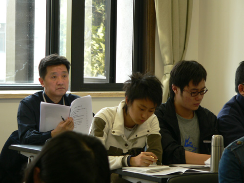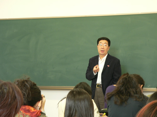 图为我院戏文系教授丁罗男在为艺教05同学讲授《电影观念史》