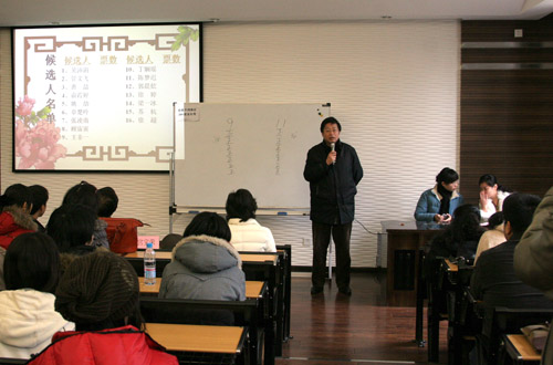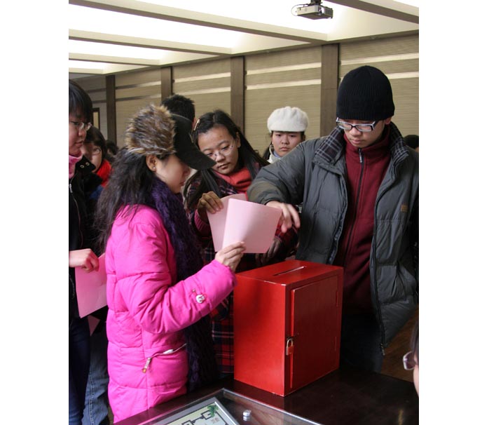 12月29日12:00戏文系首届团总支及系部学生会竞选大会在红楼209教室顺利召开。戏文系共计71名同学参加了此次选举大会。会上,18位候选人分别进行了真挚而又热情洋溢的二分钟竞选演讲,充分展示了同学们竞选的激情。整个过程中,与会的各位同学情绪高涨,现场气氛异常热烈,竞选演说完毕后,与会的同学们认真地投出了代表自己意向的一票,选出自己心目中的团总支及学生会委员。