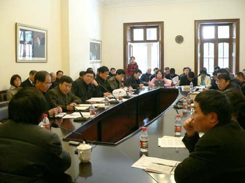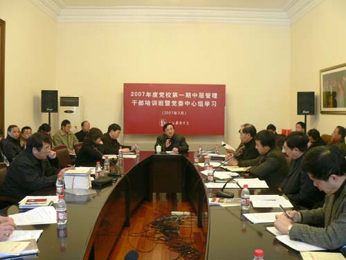 今天下午1:30分,2007年度党校第一期中层管理干部培训班暨党委中心组学习会议在我校佛西楼会议室召开。市科教党委政策研究室主任吴强、院领导贺寿昌、葛朗、韩生、刘志钢、孙惠柱及全体中层干部参加了会议。会议由副院长刘志钢主持。