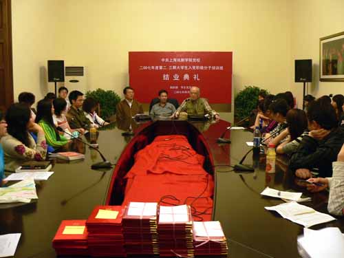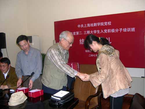 2007年4月26日晚6:30,上海戏剧学院2007年度第二、三期大学生入党积极分子培训班结业典礼在佛西楼会议室举行。组织部长兼学生党总支书记邱中岳老师出席结业典礼并讲话,本次结业典礼由林剑龙老师主持。