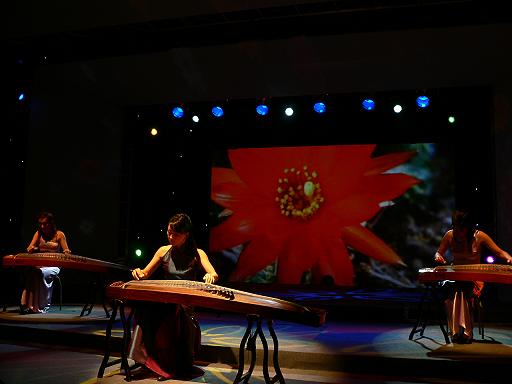 演出由《渔舟唱晚》(筝与大提琴合奏)、《萌芽》(筝独奏)、《百花引》(筝齐奏)、《剑令》(筝与打击乐)、《临安遗恨》(古筝与双排键)等5只曲目组成。值得一提的是,演出中的多媒体部分由我校多媒体演绎虚拟空间合成实验室制作完成,整体采用了水墨与3D技术等高科技手段相结合的表现手法,从不同侧面表现出古筝音乐的韵味,进一步拓展了古筝这一民族乐器的发展空间,是现代科技与传统艺术融合互动的全新尝试作品。为了呈现这样一台高水平的演出,我校虚拟实验室用了4了多月的时间,悉心针对每一首筝曲的特点进行筹划、设计与制作。