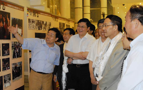 图为我校宣传部部长张生泉向各位领导介绍西藏人才培养纪实展板