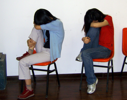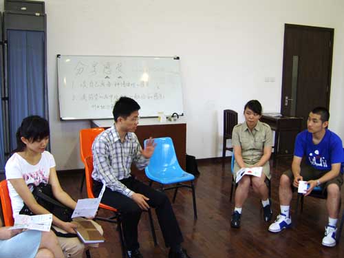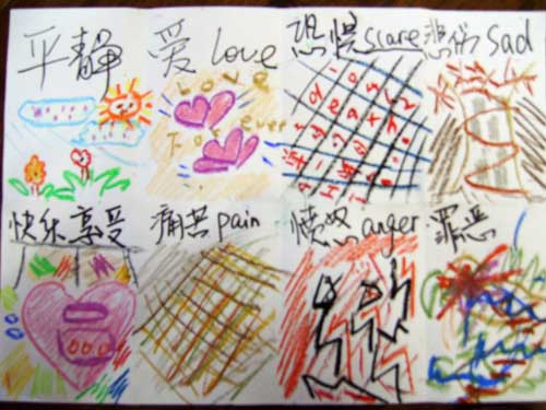本次活动的主题与我校同学兴奋度高,思维活跃的特点相挂钩,旨在使大家掌握情绪管理与调节的一些技巧,达到心理委员“要助人成长,先得自我成长”的目的。培训一开始,代替枯燥理论学习的是使心情平静的呼吸放松练习;接着,每人拿到一张白纸,一只黑色水笔和一盒蜡笔,根据乐维杰老师的指示把白纸折成八格,每一格设定一个主题,分别是“平静”“爱”“恐惧”“悲伤”“快乐”“痛”“愤怒”“罪恶”,并要求把每种情绪所联想到的画面画在纸上。通过绘画的内容找到和自己相似感觉的人,组成两人组,开始行动表达技术之雕塑、替身、扮演彼此。心理剧是一种可以使参与者的情绪得以发泄从而达到治疗效果的戏剧。通过扮演某一角色,参与者可以体会角色的情绪与想法,从而改变以前的行为习惯。在舞台上参与者所扮演的角色,其思想、感情与平日的自己是不同的,他可以体验角色内心的酸甜苦辣,成为理想自我的化身。