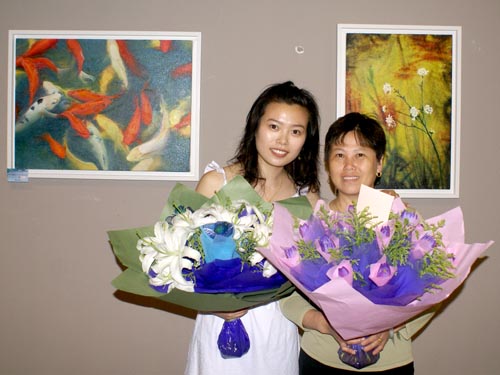 彭丽与母亲在画展上合影