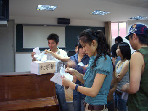 出席学生会的学生代表共有53名,会上有11名候选人分别进行了两分钟竞选演讲,或慷慨激昂或饱含深情,展现了他们对学生会工作的信心与决心,表达了他们要为学生会服务的强烈愿望,不断地将全场的气氛推向高潮。与会的各位同学也情绪高涨,台上台下融为一体。竞选演讲完毕后,与会的同学们投出了神圣的一票,选出自己心目中的学生会干部。