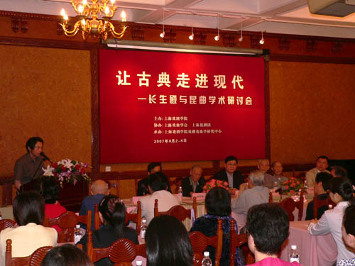 6月2日上午8:00《让古典走进现代――长生殿与昆曲学术研讨会》在上海静安宾馆举行。这次会议由上海戏剧学院主办,上海戏曲学会、上海昆剧团协办,上海戏剧学院戏剧戏曲学研究中心承办。大会共邀请了来自海外、台湾等全国各地的学者专家50多人参加。这次大会旨在探讨中国古典戏曲的前途与命运、洪�《长生殿》的演出史问题以及有关这次全本《长生殿》的演出情况等。上海戏剧学院党委书记贺寿昌在开幕上致词。开幕式结束后,来自各地的代表都纷纷发言,讨论了中国的戏曲在当今的命运和发展方向。