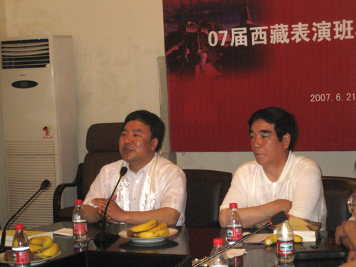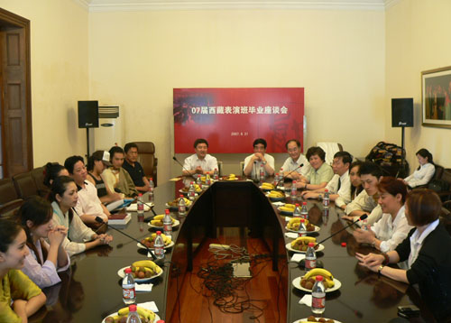 6月21日下午1点班,07届西藏表演班毕业座谈会在佛西楼会议室举行。西藏自治区文化厅党委书记马如龙、西藏话剧团团长次仁罗布,校领导韩生、刘志钢,校宣传部部长兼表演系党委书记张生泉,07届西藏班班主任王学明、带班老师达娃片多,07届西藏班主要任课老师及全体07届西藏表演班学生参加了座谈。会议由校统战部部长黄桂英主持。