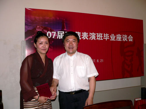 会上,校宣传部部长兼表演系党委书记张生泉首先发言,对3年来关心西藏班成长的全校师生及社会各界友好人士表示了感谢,祝福西藏班的同学早日从雏鹰变为雄鹰,翱翔在西藏的蓝天下。随后,副院长韩生向07届西藏表演班带班老师达娃片多颁发了“优秀班主任”荣誉证书,感谢和嘉奖达娃片多老师3年来为07届西藏表演班所做出的辛勤付出。