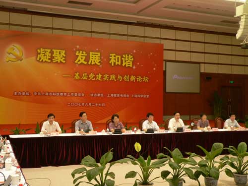 6月27日下午2:00,《凝聚 发展 和谐――基层党建实践与创新论坛》在市科学会堂国际会议厅召开。市科教党委书记李宣海、市科教党委副书记翁铁慧等市科教党委领导出席论坛。来自市科教党委系统的基层党建负责人约400余人参加了论坛。论坛由市科教党委副书记李铭俊主持。
