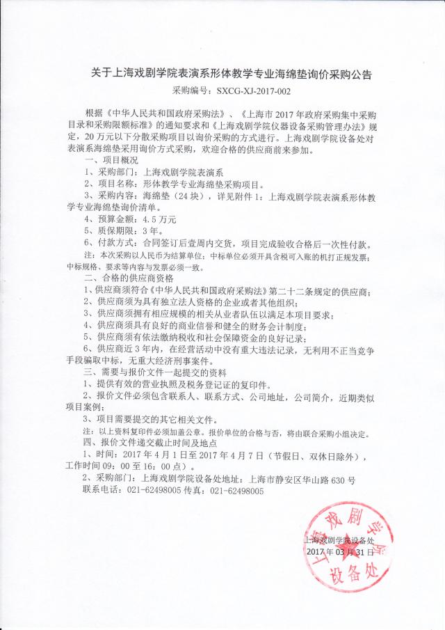 关于上海戏剧学院表演系形体教学专业海绵垫询价采购公告