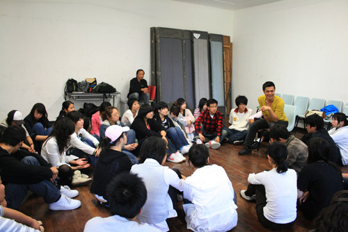 曾文通老师携带其舞台、服装设计作品《两条老柴玩游戏》到上海话剧中心演出。10月18日下午,曾老师来到上海戏剧学院,为学生开展了一堂题为“身体体验剧场――香港舞台设计讲座”工作坊,并于坊间与学生们展开了热烈的交流。讲座上,曾老师提出了舞美设计的新观念:创作一出戏其实很简单,不一定就得从剧本开始,有时能从舞台设计或其他部分先开始,编剧不一定得在家里的书桌上完成创作,实地编写也许能让该剧本更实用,更属于舞台;有效的舞台设计是布景,是和该剧一起呼吸的。无效的舞台设计仅仅是背景,是多余的装饰,道具的选择不管从颜色或质感上都应该是和该剧有关系的;每一次在考虑剧场空间时,应该做更多的舞台试验,尝试将道具摆放在不同的角落已获得更多的空间效果等等。