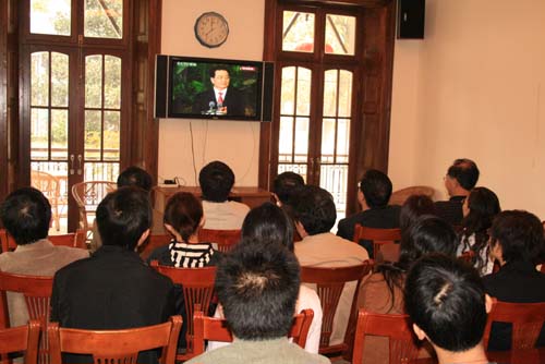 我校领导贺寿昌、葛朗、韩生、刘志钢与有关干部、党员一起收看了这个特别节目,聆听了胡锦涛总书记代表新一届中央领导所作的重要讲话。(撰稿:白水 摄影:雨田)