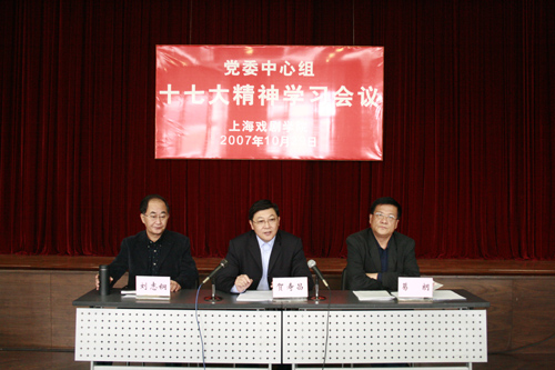 今天下午1:30,我校党委在华山路校区的红楼东排练厅举行传达贯彻十七大精神中心组学习会议。党委书记贺寿昌主持会议并代表党委对下一阶段学习落实十七大精神做了重要讲话。党委副书记葛朗、副院长刘志钢在会上传达了中央和市委关于学习十七大精神的有关会议精神和文件精神。全校中层干部60余人出席会议。
