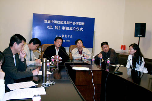 经过上星期紧张严格的剧组招募, 2007年10月30号中午在熊佛西楼举行了《风铃》的建组仪式。出席这次仪式的有校领导党委副书记、副院长葛朗老师,宣传部部长兼表演系党支部书记张生泉老师,团委书记陈云老师,表演系系主任龙俊杰老师,副主任何雁老师,党支部副书记王学明老师,辅导员陈莹老师,还有剧社骨干、演员以及剧务、舞美人员。