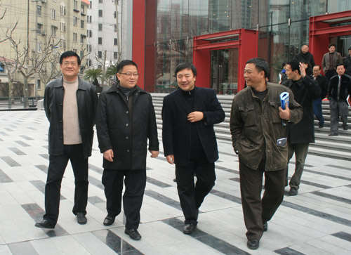图为胡劲军(左二)在韩生、葛朗的陪同下参观实验剧院