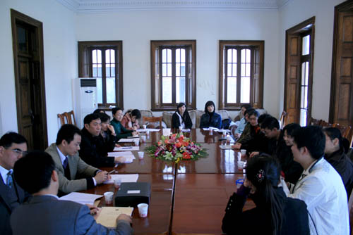 今天,上海市学位办、市教育评估院组织上海交通大学、同济大学、东华大学、外贸学院、外国语大学等多所大学的研究生培养资深专家莅临我校,对我校研究生培养工作进行了一次严格的实地质量检查。检查小组一行共七人,以交通大学研究生院副院长刘明柱为组长、东华大学舒慧生为副组长。我校副院长韩生(主持工作);副书记、副院长葛朗;副院长刘志钢;副院长孙惠柱陪同检查。