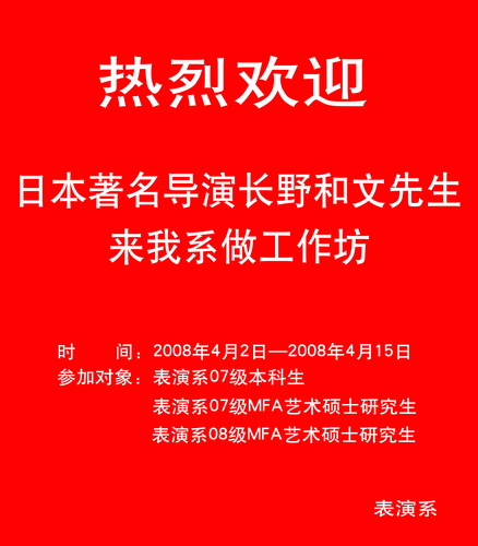4月2日~15日,日本著名导演长野和文先生赴我校表演系为表演系07级本科生、07级MFA艺术硕士研究生、08级MFA艺术硕士研究生举办工作坊。