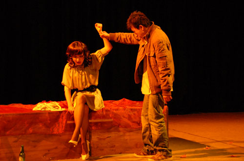 幸好天无绝人之路,剧组统筹通过朋友找到一个电话――上海民间戏剧圈内的名人东剧场“场主”Ben。在电话交流中,双方确定在“5•1”节前夜上演《长椅》。剧组第一时间赶印第二版演出海报。接下来的几天两位主演苏永豪、娄霄霄连夜在排练教室把因课业繁忙落下的戏重新拾起,剧情、调度安排更为合理、紧凑。演出前一天,统筹和来自舞美系07级灯光班的董鹤、袁俊豪同学利用课余时间在剧场通宵装台,终于使不演话剧近一年的“东场”找回了久违的舞台感觉。