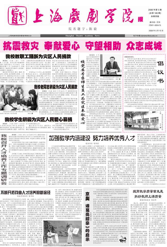 《上海戏剧学院报》2008年第5期已出版(总186期)已于5月15日出版。本期重点内容有:《校党委号召师生员工为灾区奉献爱心》、《我校教职工踊跃为灾区人民捐款》、《我校老同志积极为灾区人民捐款》、《我校学生积极为灾区人民爱心募捐》、《我校召开人才培养工作专题调研会》等,敬请关注。