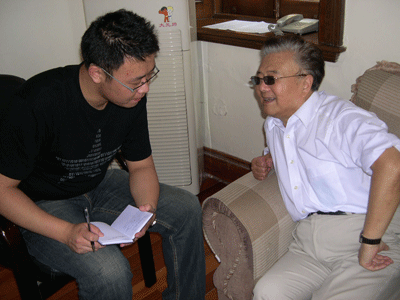 图为学生记者采访老干部参加活动的感想