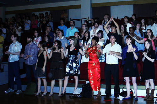 5月23日晚7点30分,由电视艺术学院06主持发起和策划的题为“这一刻,我们……”赈灾演出于莲花路校区新剧场拉开序幕。来自电视艺术学院、戏曲学院、舞蹈学院、表演系、舞台美术系等多个院系的同学共同参与了此次演出。团委陈云老师、徐晶老师,学生处张国丽老师,电视艺术学院吴洪林老师、宋怀强老师、赵武老师等也前来观看了晚会。场内座无虚席,很多同学站着看完了整场演出。我校的留学生们也从华山路赶来观看,并在门口团结抗灾的红色条幅上签名。