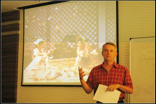 在讲座中,他首先介绍了NIDA的课程设置,其次介绍了NIDA培养设计系学生的理念:第一,培养学生的动手能力,绘画技能是一切设计的基础,只有基础扎实,才可能有好的设计作品,他要求NIDA设计系的学生们每天必须花相当的时间在绘画上;第二,戏剧作品的制作是一个综合性的过程,舞美设计要与其他戏剧部门有效合作,才能制作出相对完美的作品。一个好的舞台美术设计师,除了要及早与导演进行沟通,在进行设计的时候,他同时也是一个编剧、导演、灯光设计师,甚至演员,要在头脑中复现出整个剧作的样貌;第三,培养学生开阔的想象力。如用当代时尚的设计元素去复现莎剧的时代,来营造一种奇特的戏剧氛围;第四,提升学生的自信力。在第二学年,设计系的学生会参与四到五部作品的制作,培养其实践能力,如服装设计专业学生为某出戏制作的服装会在剧作正式公演以前进行展示,由演员亲自着装,感受服装的舒适度,是否符合人物性格,导演和专业人士都会到场,进行评判,提出建议。以上所述的这些综合素质的培养,让NIDA的毕业生们做好充分的准备,使他们信心十足地走向今后的职业生涯。