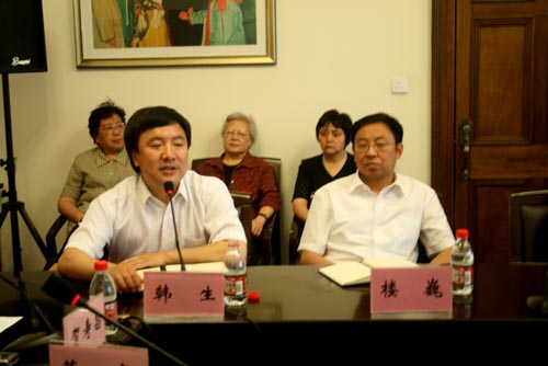 韩生同志通报学院08年上半年行政工作(右为我校新任命的党委副书记楼巍同志)