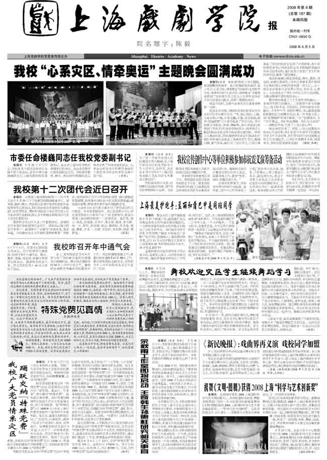 《上海戏剧学院报》2008年第6期已出版(总187期)已于6月5日出版。本期重点内容有:《我校“心系灾区、情牵奥运”主题晚会圆满成功》、《市委任命楼巍同志任我校党委副书记》、《我校第十二次团代会近日召开》、《我校召开年中通气会》、《特殊党费见真情》等,敬请关注。