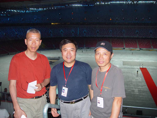 韩生副院长(中)和舞美系刘永华主任(右)作为开幕式顾问在鸟巢排练结束后与蔡国强合影