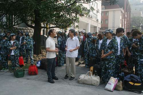 9月1日上午8时,我校2008级的480余名新生穿上崭新的迷彩服,背上行装,赴松江青少年活动营地进行为期9天的军训活动。一大早,院领导韩生及各院系领导来到新生中间,勉励同学们珍惜难得的军训机会,向部队学习,磨练自己、提高自己,上好进入上戏后的第一堂课,为今后的四年大学生活创造一个良好的开端!