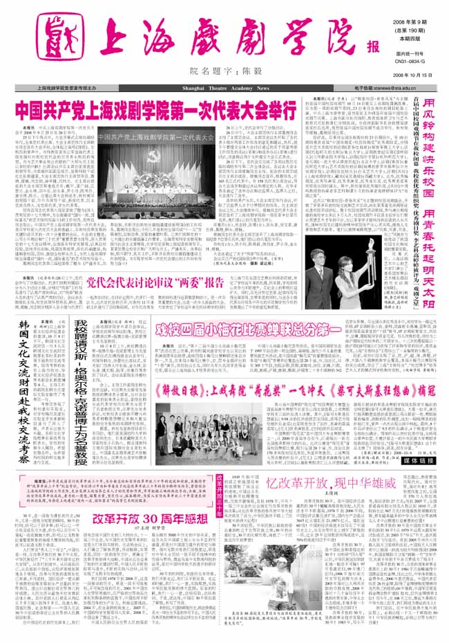 《上海戏剧学院报》2008年第9期已出版(总190期)已于10月15日出版。本期重点内容有:《中国共产党上海戏剧学院第一次代表大会举行》、《首届中国校园戏剧节在我校闭幕》、《党代会代表讨论审议“两委”报告》、《韩国文化交流财团赴我校交流考察》、《我校聘请汉斯-格奥尔格•克诺普博士为名誉教授》、《戏校四届小梅花比赛蝉联总分第一》等,敬请关注。
