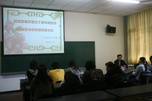 我校举行纪念改革开放30周年报告会暨《形势与政策》课恢复开课仪式于11月13日、14日先后在华山路校区和莲花路校区举行。党委宣传部部长张生泉主持了两校区开课仪式,上海外国语大学教授窦晖做了“历史从这里开始转折��纪念党的十一届三中全会和改革开放30年”的专题报告。公教部副主任陈敏、学生处副处长徐咏、团委书记陈云率有关思政课教师和专职辅导员出席了仪式并在听取了窦教授课程基础上进行了集体备课。