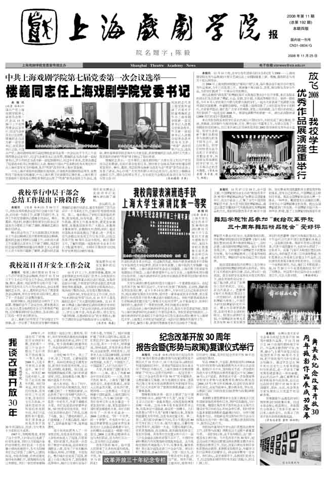 《上海戏剧学院报》2008年第11期已出版(总192期)已于11月25日出版。本期重点内容有:《中共上海戏剧学院第七届党委第一次会议选举――楼巍同志任上海戏剧学院党委书记》、《放飞2008――我校学生优秀作品展演隆重举行》、《我校举行中层干部会总结工作提出下阶段任务》、《我校内蒙表演班选手获上海大学生演讲比赛一等奖》、《舞蹈学院作品参加“献给改革开放三十周年舞蹈精品晚会”受好评》、《改革开放三十年纪念专栏》等,敬请关注。