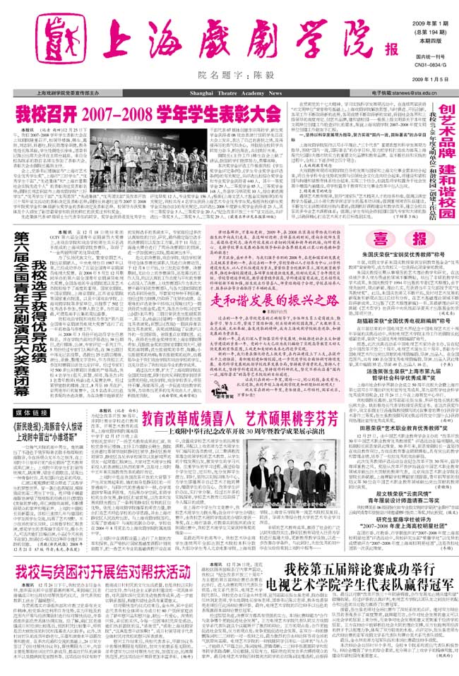 《上海戏剧学院报》2009年第1期已出版(总194期)已于2009年1月5日出版。本期重点内容有:《我校召开2007-2008学年学生表彰大会》、《创艺术品牌 建和谐校园》、《第六届全国青年京剧演员大奖赛闭幕 我校选手获得优异成绩》、《教育改革成绩喜人 艺术硕果桃李芬芳》、《我校与贫困村开展结对帮扶活动》、《我校第五届辩论赛成功举行 电视艺术学院学生代表队赢得冠军》等,敬请关注。