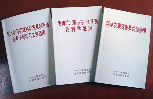 根据学习实践活动的整体部署,我校学习实践活动领导小组日前已向全体共产党员和有关干部发放《科学发展观重要论述摘编》、《毛泽东、邓小平、江泽民论科学发展》、《深入学习实践科学发展观活动领导干部学习文件选编》等理论读物。这些读物由中央文献研究室和党建读物出版社联合出版,主要内容是党的三代核心对科学发展的论述和党的十六大以来以胡锦涛同志为总书记的党中央关于科学发展的一系列重要讲话和重要文件的汇编;主要功能是配合正在全党开展的深入学习实践科学发展观活动,为广大党员、特别是领导干部自觉学习马克思主义理论提供帮助,为理论联系实际解决老百姓迫切希望解决的问题提供思考。(图/文 白水 编辑/子鱼)