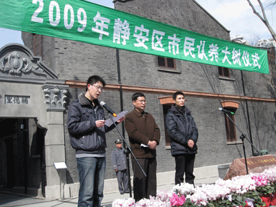 2月8日上午,我校戏文系、导演系、舞美系、创意学院、研究生部等部分同学来到上海市静安区延中绿地,参与静安区延中绿地树木认养活动。上午10:00,认养活动正式启动,创意学院媒体创意07级李宗禹同学代表我校做题为《绿色守望》的发言,表达了大学生对城市、对生态环境的关注与热爱,受到活动主办方及其他活动参与团体的一致好评。