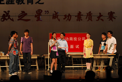 在进行综合素质测试的同时,各代表队进行“职场万花筒”的陈述。各院系的代表利用PPT幻灯片进行现场讲解,对本专业的历史和现状、同学们毕业后的去向和发展前景进行阐述。创意学院的PPT形象生动、美观简洁,赢得了一致好评,而电视艺术学院的讲解语言得体、富有激情,调动了现场的气氛。