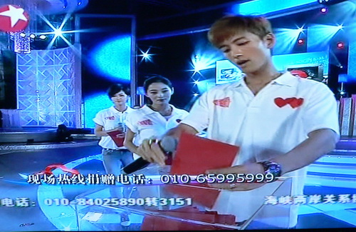 图为张俊宁在演完节目后捐款(摄自电视画面)