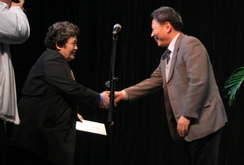 谭晶华先生向为中俄文化交流做出突出贡献的我校沙金老师颁发“荣誉证书”