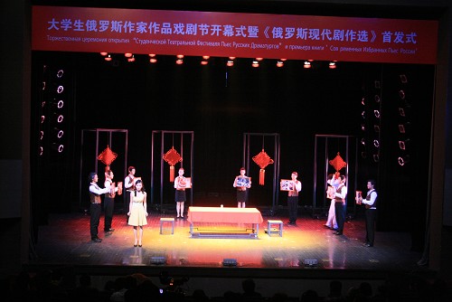11月28日晚,2009中国“俄语年”活动――大学生俄罗斯作家作品戏剧节开幕式暨《俄罗斯现代剧作选》首发式在我校端钧剧场隆重举行。