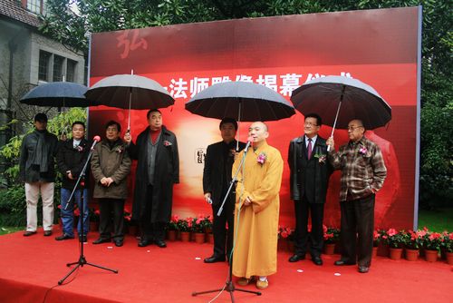 12月10日下午, 继全国版音乐剧《弘一法师》在上海大剧院成功落幕以及青春版音乐剧《弘一法师》成功上演之际,弘一法师雕像揭幕仪式在我校隆重举行。上海文广集团演艺中心副总裁、中国话剧艺术研究会副会长杨绍林, 上海市佛教协会主席觉醒法师的代表慧觉法师,著名表演艺术家俞洛生、张先衡,天津戏剧博物馆前馆长黄殿祺,弘一法师雕像捐赠者、上海城市雕塑艺术中心副理事长郑培光和上海大学美术学院综合材料与公共艺术工作室主任蒋铁骊,我校领导韩生、葛朗及院长助理王宏舟,我校叶长海教授、丁罗男教授、熊源伟教授(音乐剧《弘一法师》导演)、曹路生教授(音乐剧《弘一法师》编剧)、宋怀强教授(音乐剧《弘一法师》主演)和教师、学生代表近百人,一同出席了此次揭幕仪式。揭幕仪式由副院长葛朗主持。