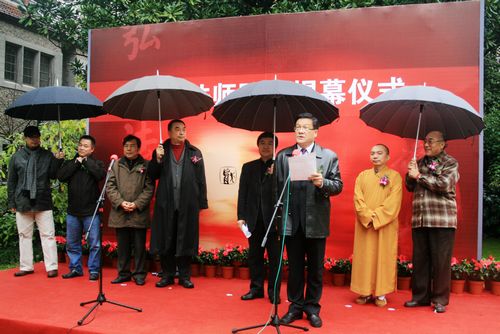 图为杨绍林先生、慧觉法师和叶长海教授共同为弘一法师雕像揭幕