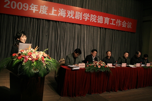 1月7日下午,2009年度上海戏剧学院德育工作会议在新实验空间剧场隆重举行。我校党委书记楼巍,院长韩生,副院长葛朗、刘志钢、孙惠柱,院长助理徐幸捷出席会议。会议由葛朗主持。我校全体中层干部及班主任辅导员、思政教师近百人参加此次会议。会前观看了反映我校校园文化建设的短片《青春的蓓蕾》。